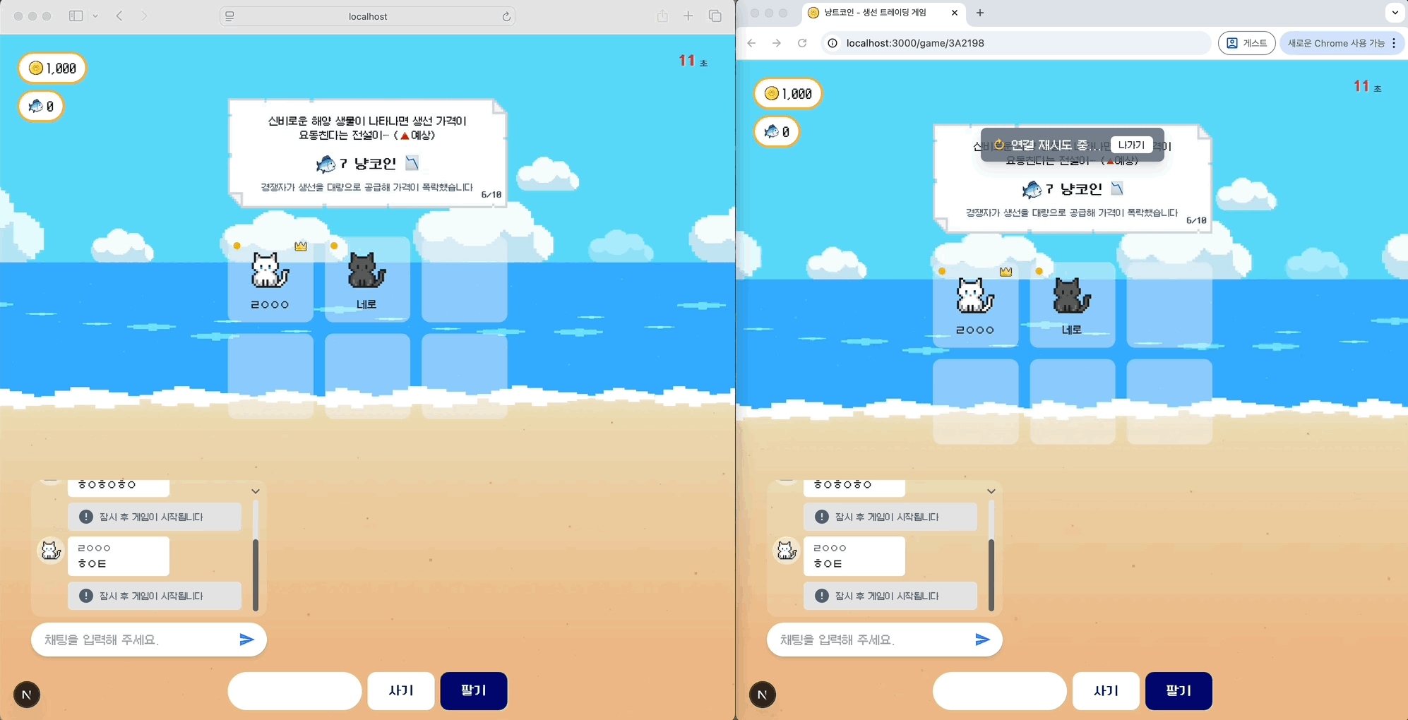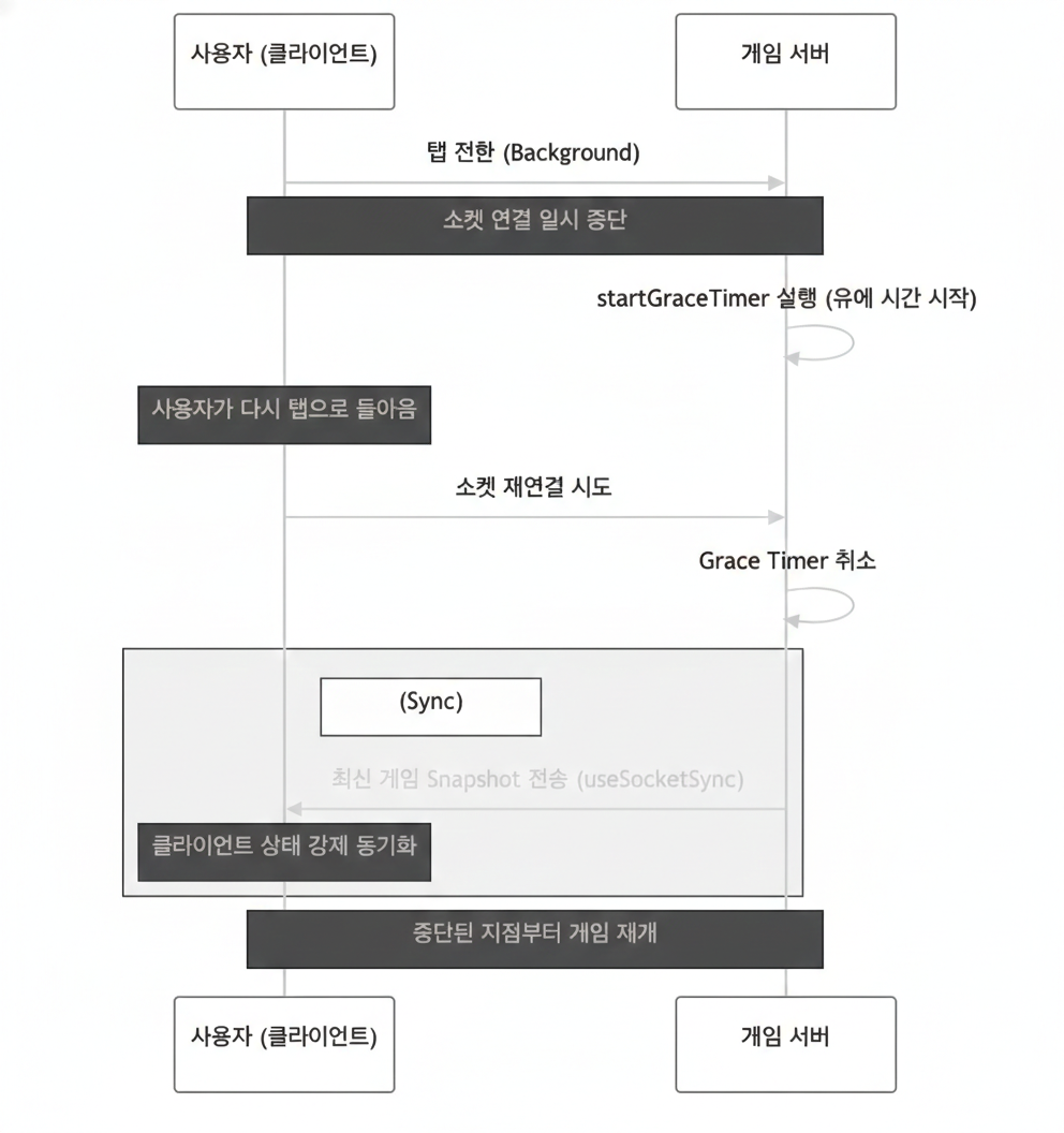 - 탭 전환이나 네트워크 일시 중단 이후에도 게임 상태가 어긋나지 않고 이어질 수 있도록 설계
