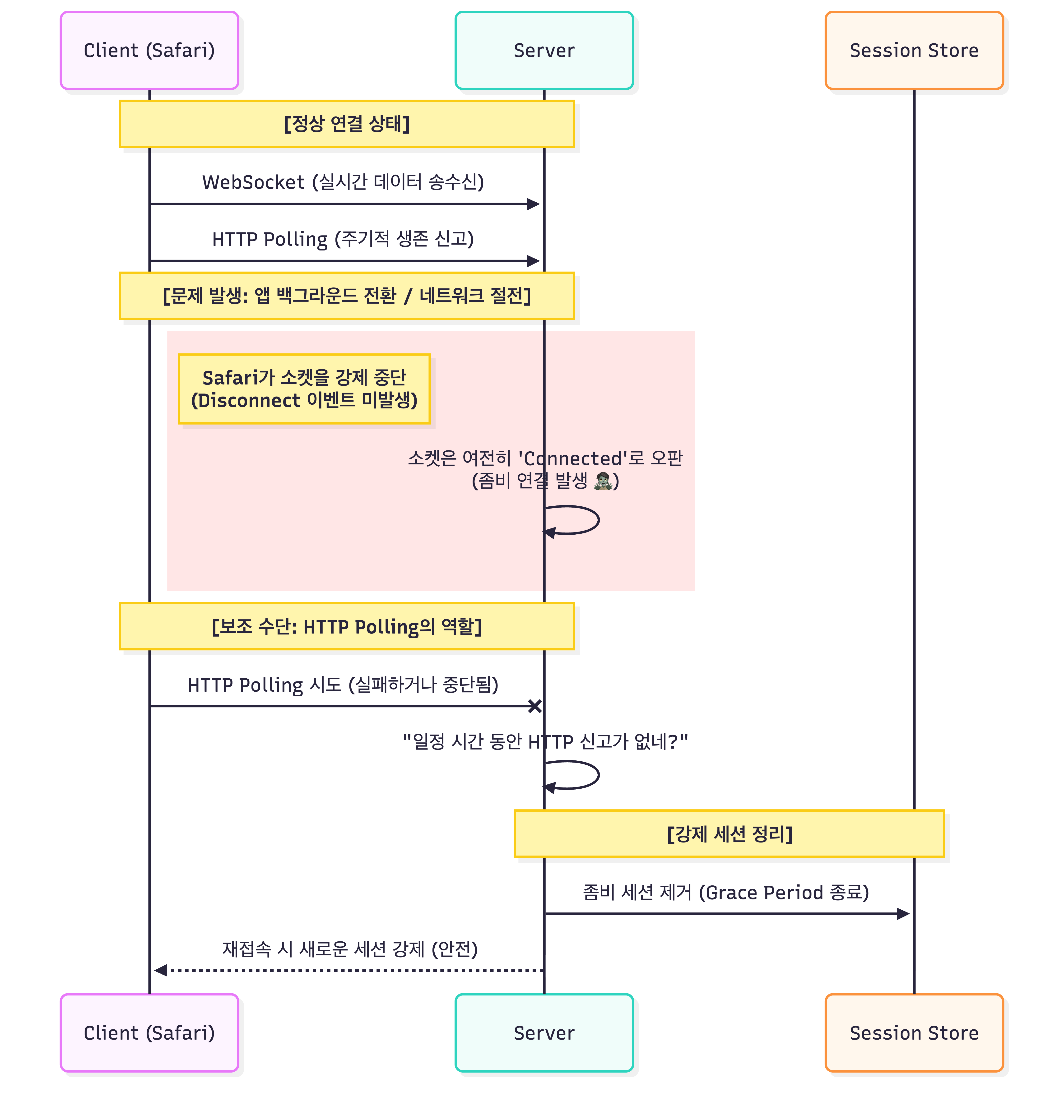 이로 인해 하나의 수정이 다른 흐름에 영향을 주거나, 특정 환경(특히 모바일)에서만 재현되는 문제들이 반복되었습니다. 단순한 예외 처리가 아니라, 연결 단절을 전제로 한 설계 자체가 필요하다는 판단에 이르게 되었습니다.