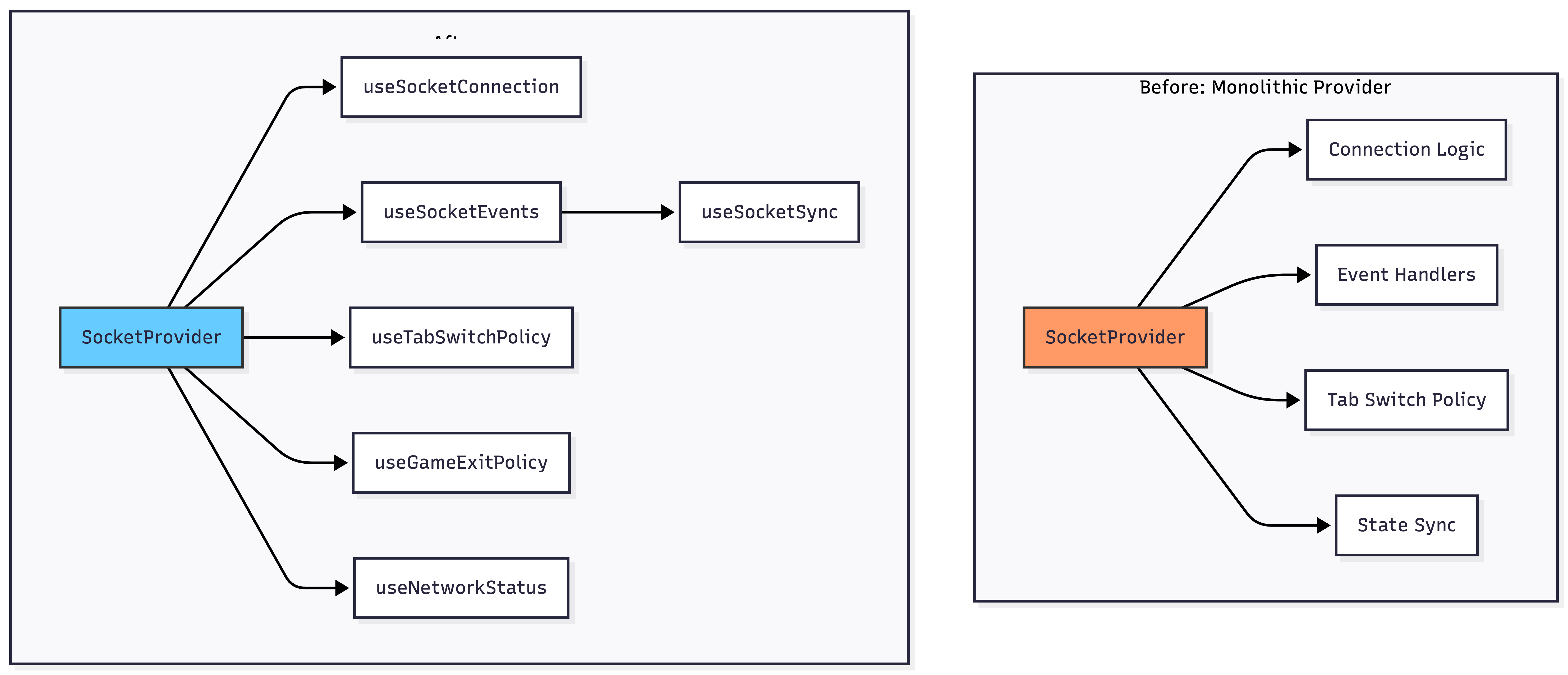 그래서 SocketProvider를 유지하되, 역할별로 책임을 분리한 커스텀 훅들의 조합 구조로 리팩토링했습니다.